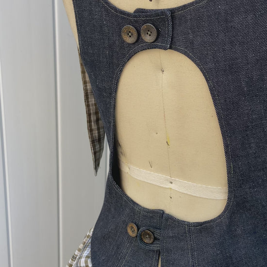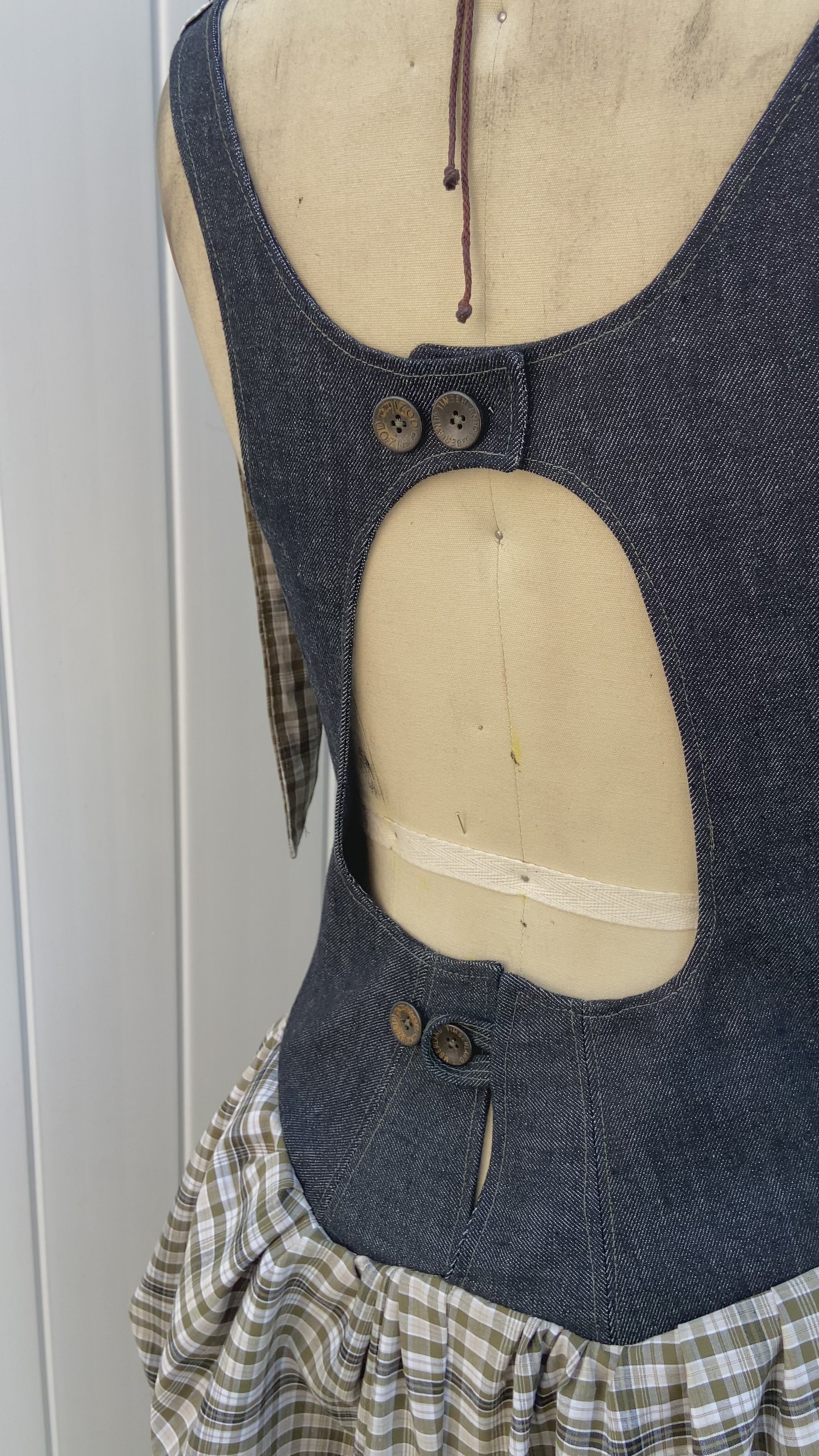 Constructed using a light weight Japanese denim paired with a green Cotton plaid fabric with olive green top stitching. Featuring two bows on each side of the dress.
