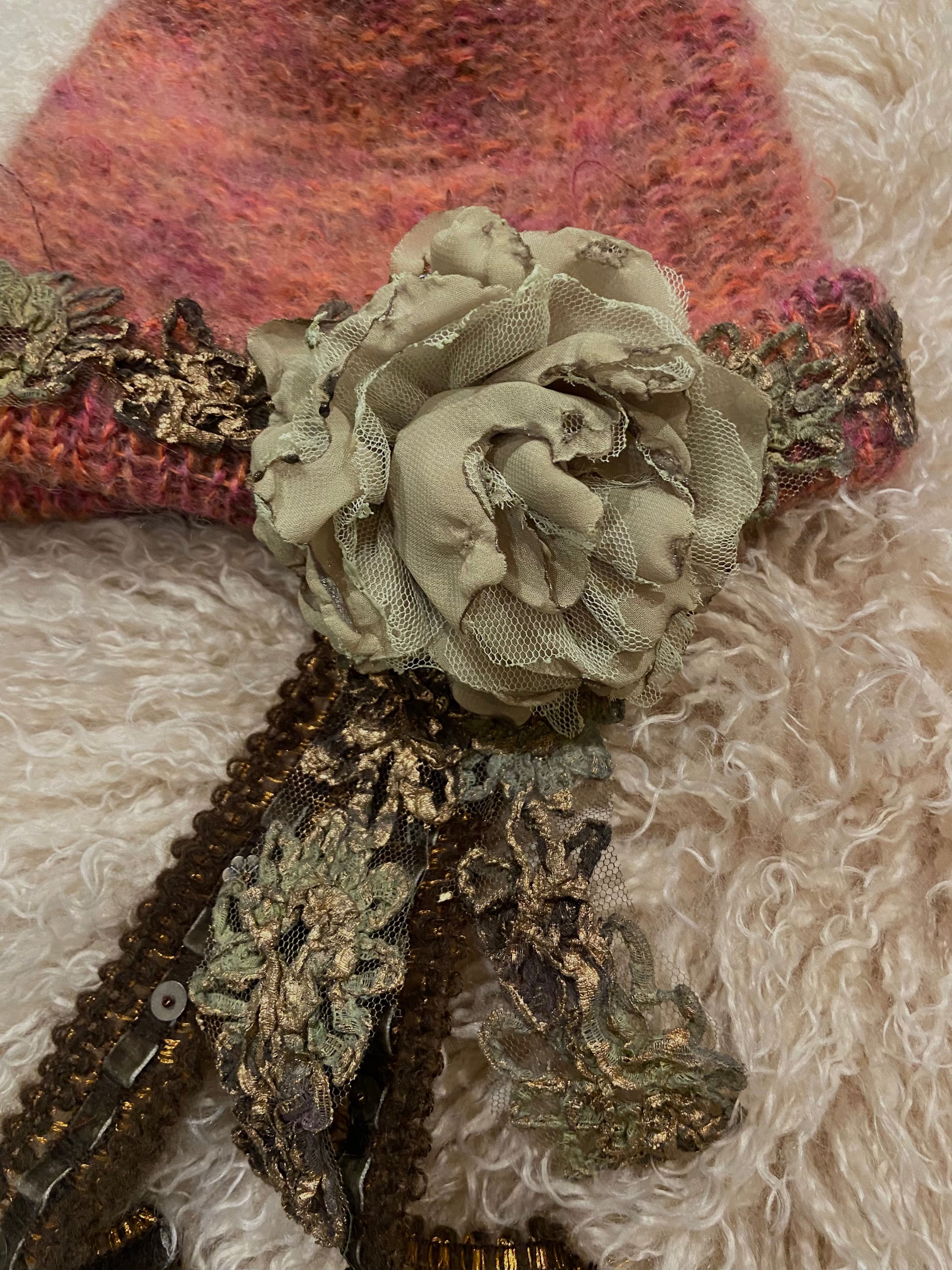 Mohair knitted hat inspired by the iconic "Truffula Tree" in the Dr. Suess movies. This specific hat features a hand painted dried lace with a dainty flower that has been burned.