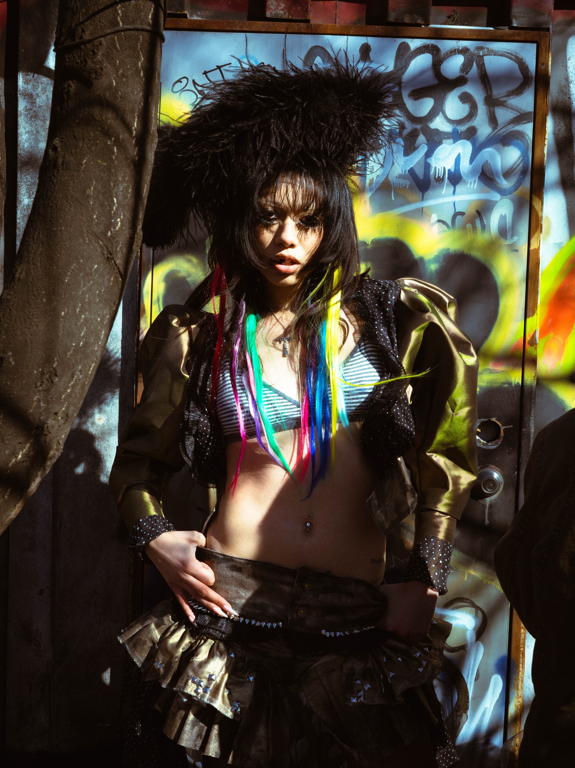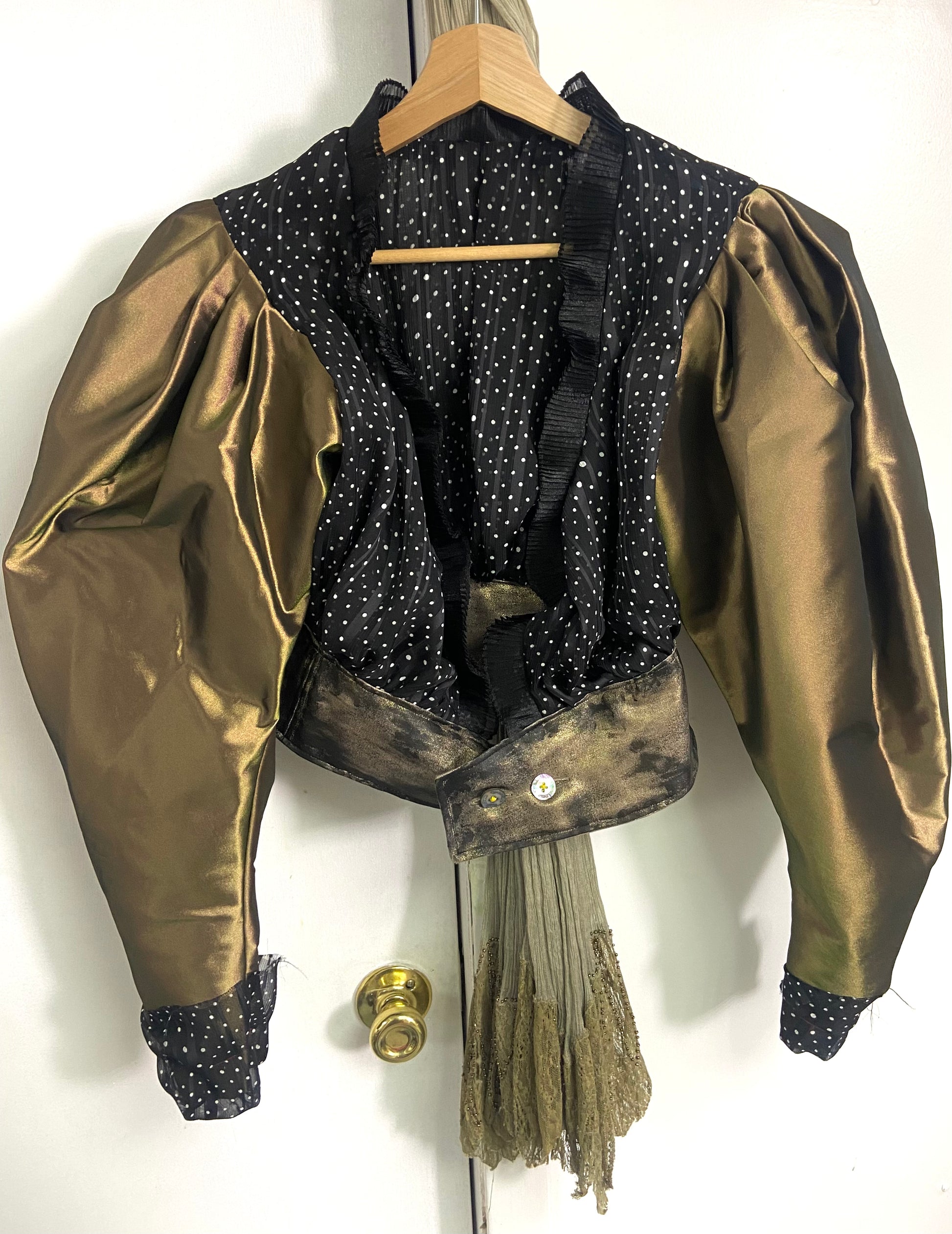 Featuring two major puff sleeves that have raw edge finishing with red embroidery. The majority of the garment is constructed using a light polka dot fabric. (Fits on a size 6)